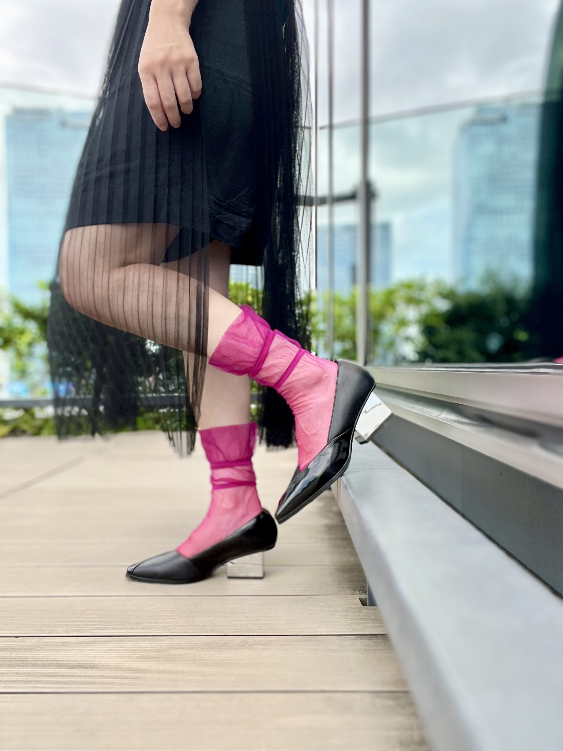ユニークなカラーブロックと幾何学的なブロックヒールが個性的な印象に