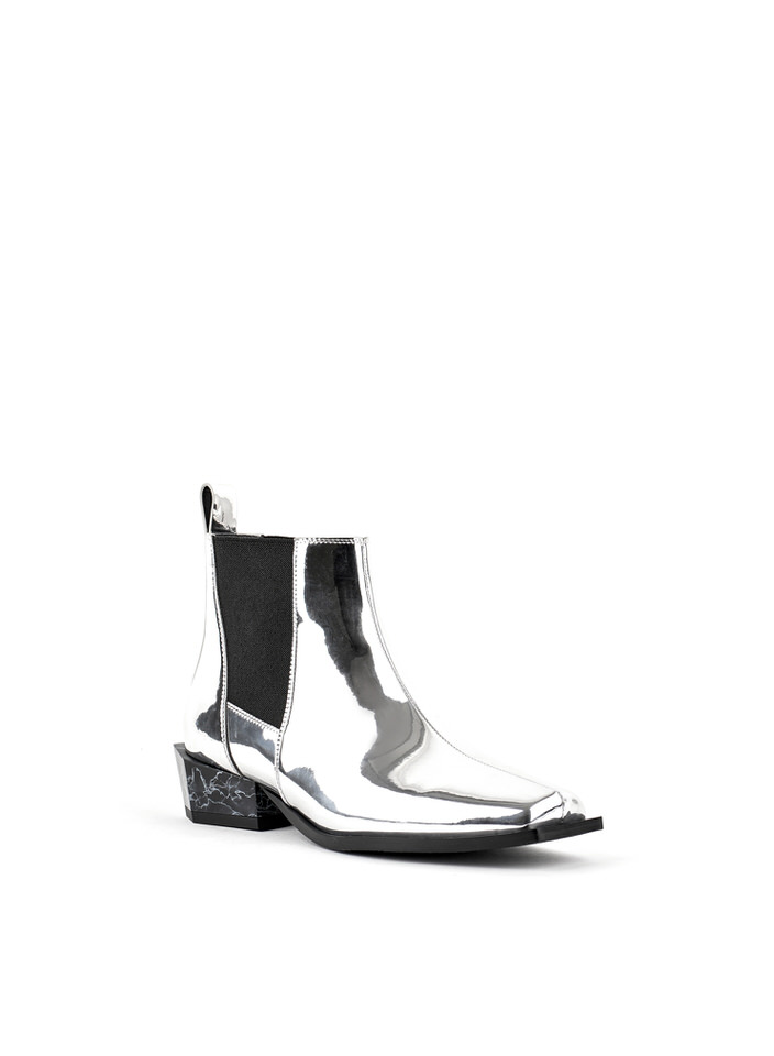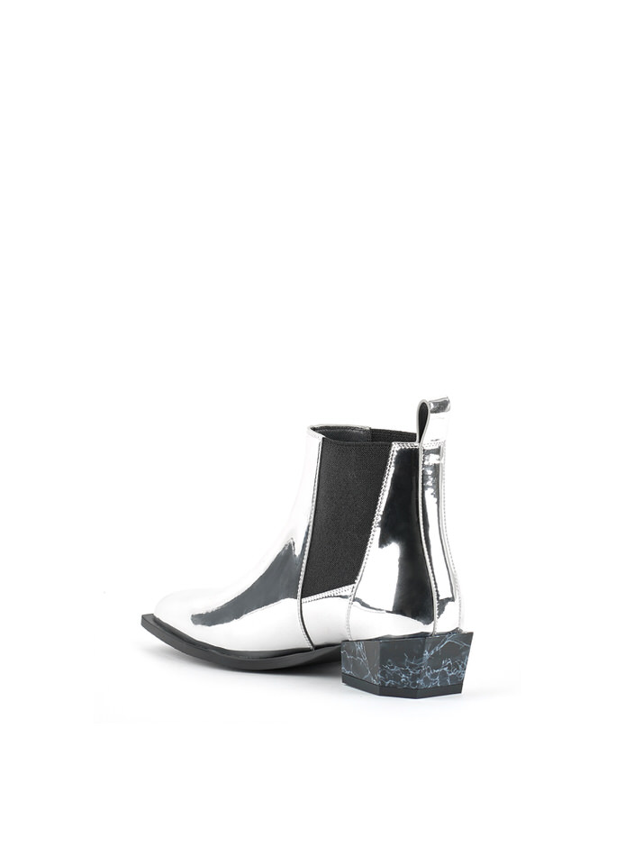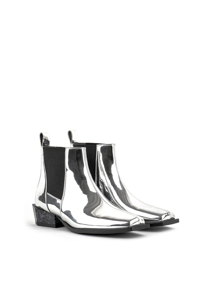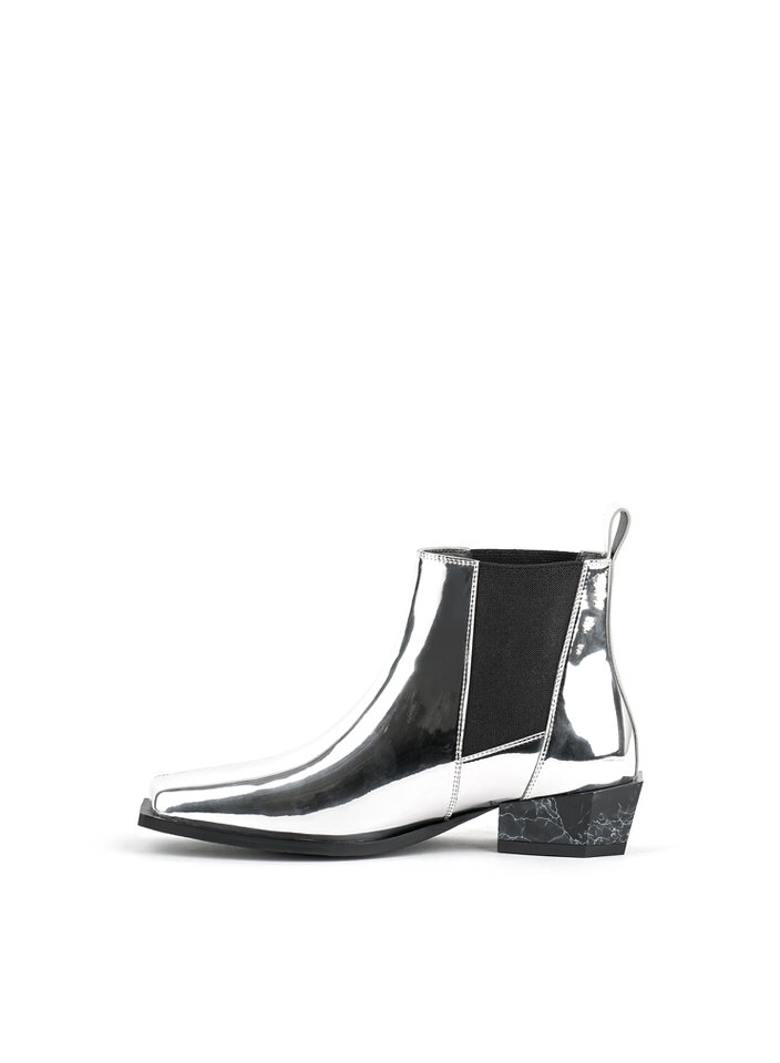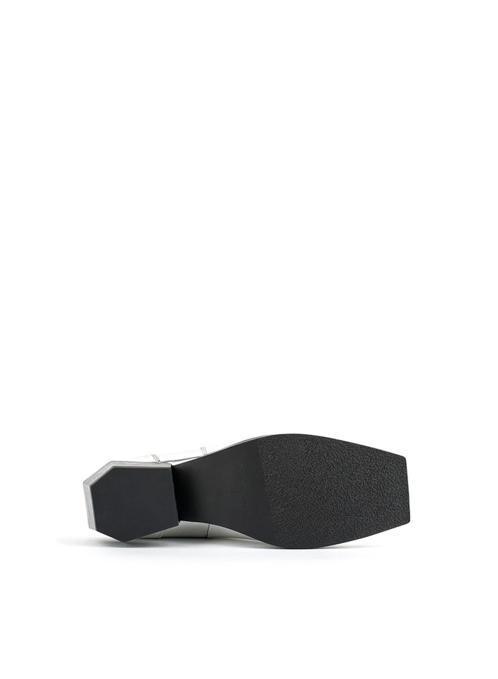 ミラーレザーのアッパーがシンプルなデザインに映え、コーディネートのワンポイントに。